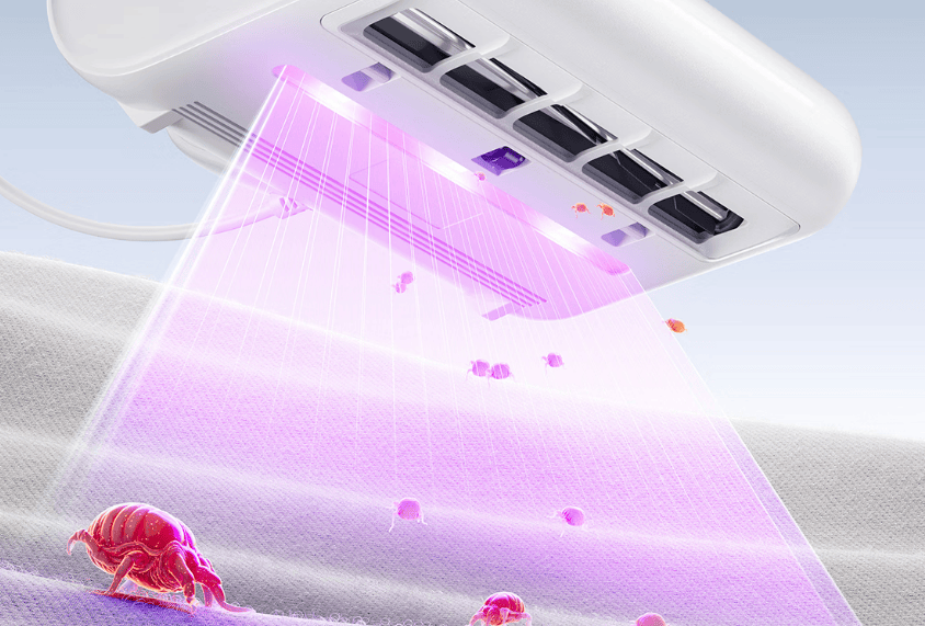更突破性整合UV-C紫外线与恒温除螨双模组:5颗UV-C灯珠阵列释放253.7nm黄金波段,直接破坏微生物DNA;65°C智能热风系统可穿透织物深层灭活虫卵,同步实现深度烘干。双效协同不仅达到100%即时除螨率,更能形成长效防护屏障,从根本上抑制螨虫再生,为家居环境提供全方位健康守护。