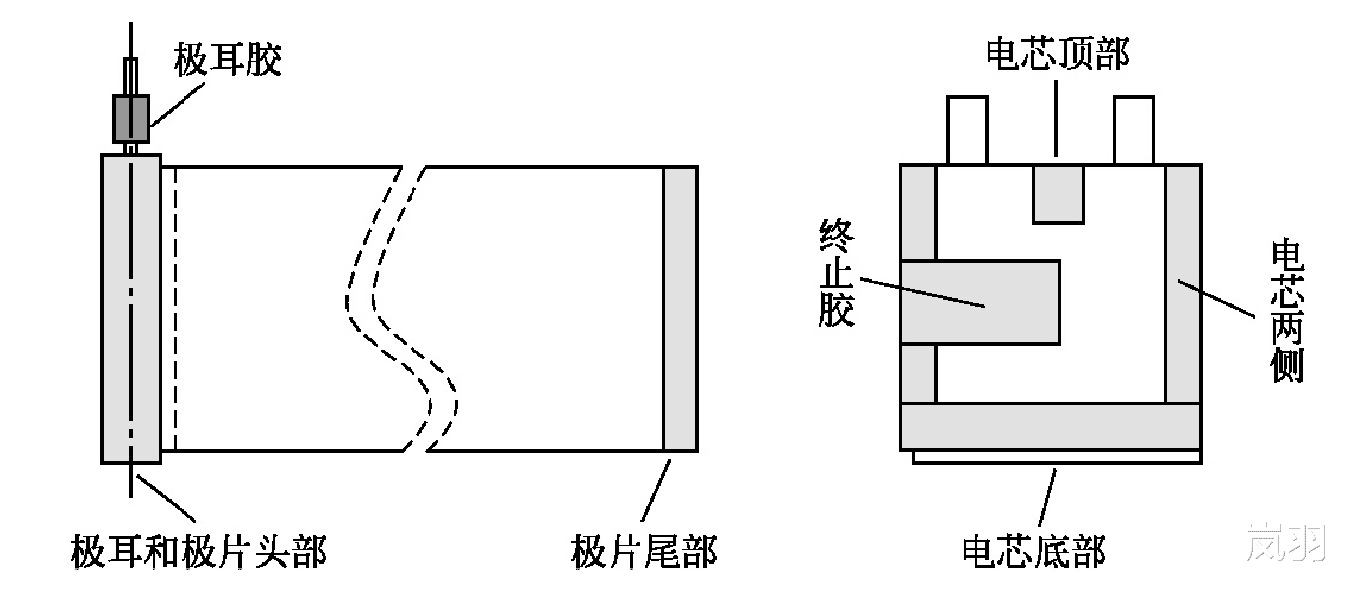 贴胶是将胶带贴于极片和电芯的过程。对于卷绕和叠片电芯,应对电芯的底部、侧面、顶部和卷绕终止处进行贴胶。对于卷绕的极片,在极片的头尾部、焊接极耳处以及极耳引出部位也需要贴胶,如图7所示。