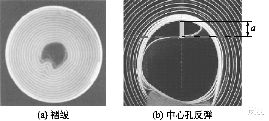 相对于圆柱形电池,采用片式卷针的方形电池卷绕时张力波动更大。张力严重波动会导致电芯内部的电极产生膨胀,造成电芯变形、卷绕不整齐、电池表面不平整等。张力控制时要考虑为电芯在后续充放电过程中的膨胀预留膨胀空间。常见的张力过大导致的缺陷为电芯内部褶皱和中心孔反弹,见图5。这些褶皱可能是由电芯内部压力过大导致的,中心孔反弹可能是由张力过大造成的。
