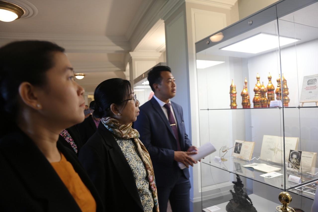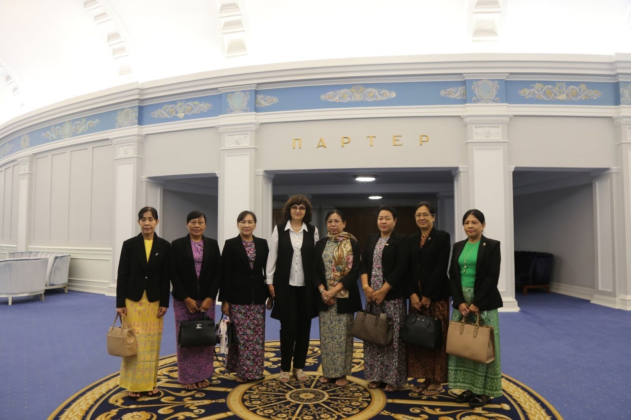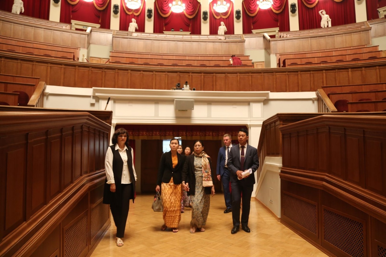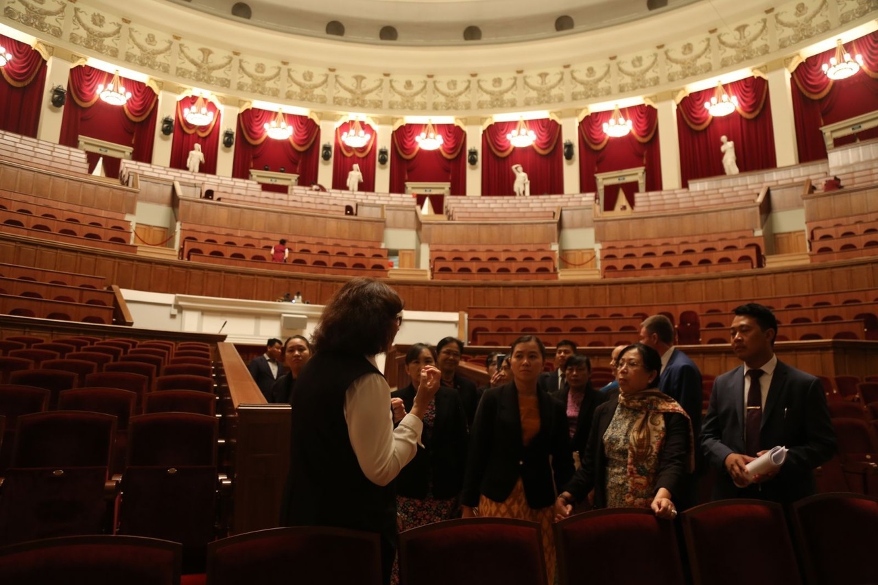 敏昂莱夫人杜菊菊腊(Daw Kyu Kyu Hla)一行参观了位于新西伯利亚万豪酒店附近的世界最大剧院之一的新西伯利亚国立模范歌剧芭蕾舞剧院,负责官员带领客人参观了剧院。
