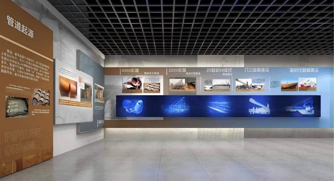 管道的起源采用超长幻影成像结合图文,展示管道由陶制管道至现代管道更新迭代的模型场景,亦真亦幻的场景,娓娓道来的故事,让观众进入管道的世界。
