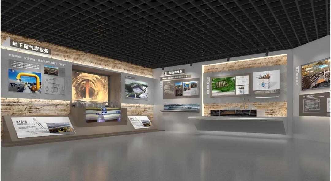 地下储气库业务展区岩层质感的创意展墙带观众进入地下储库展区,剖面模型结合动画原理展示地下储库原理。