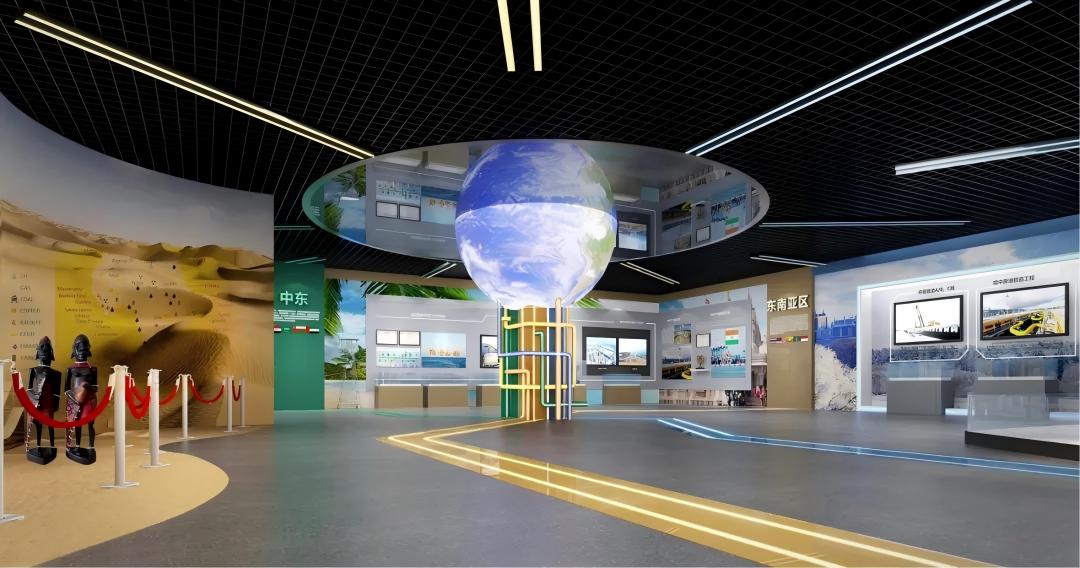 本层我们将指挥部场景与牛车运管场景重新布局,确保空间开阔的同时提升场景张力。国际工程展区是重点打造区域,拆除部分展墙,顶地统筹考虑,以“全球视野、开放合作”为设计理念,结合空间内部柱子打造环形中岛布局,空间格局开阔,观展更为舒适。