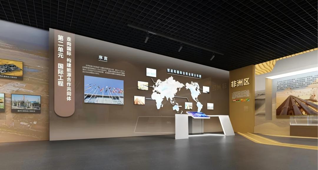 进入工程科技厅,脚印墙见证了管道人遍布世界的足迹,互动触摸屏展示管道局8项主营业务,图文灯箱结合屏幕展示管道局规划设计及科研能力。