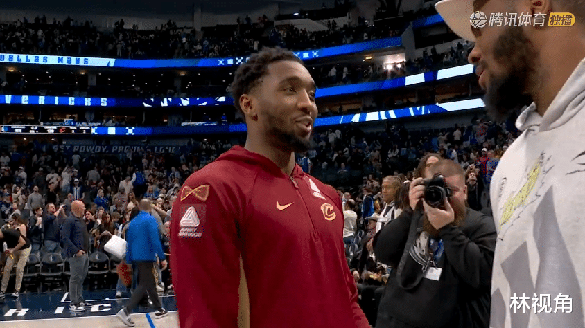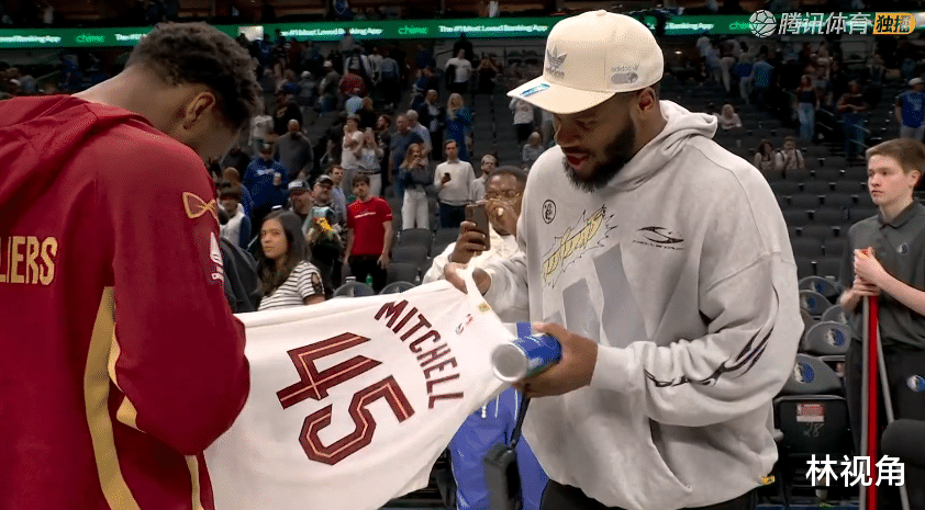 比赛结束,双方球员很友好,在场上互相拥抱致意,有说有笑,米切尔来到场边,为另一个联盟中的球星送上亲笔签名球衣。