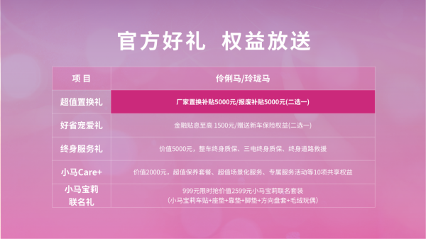 不止智趣满格,奔腾小马还为两款新车型准备了超给力的上市福利,超值置换、好省宠爱、终身服务、小马Care+、小马宝莉联名5重大礼,购车、用车、养车、玩车包圆了,其中厂家置换补贴或报废补贴高达5000元。加上新能源汽车“国补”2万元优惠政策,不愧是最近车圈爆火的性价比小可爱。
