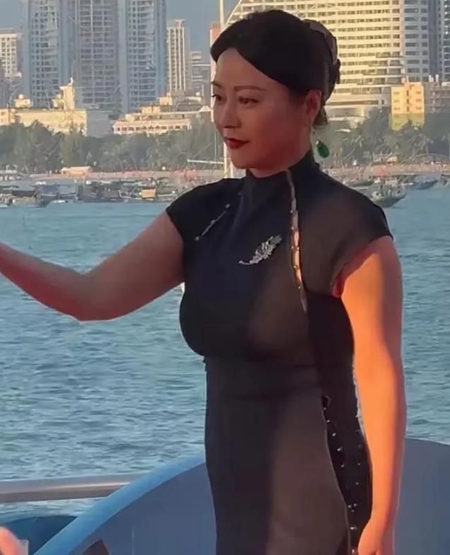 身穿一条黑色高开叉中式旗袍,整个人看上去虽然有些丰腴,但却格外的有魅力。