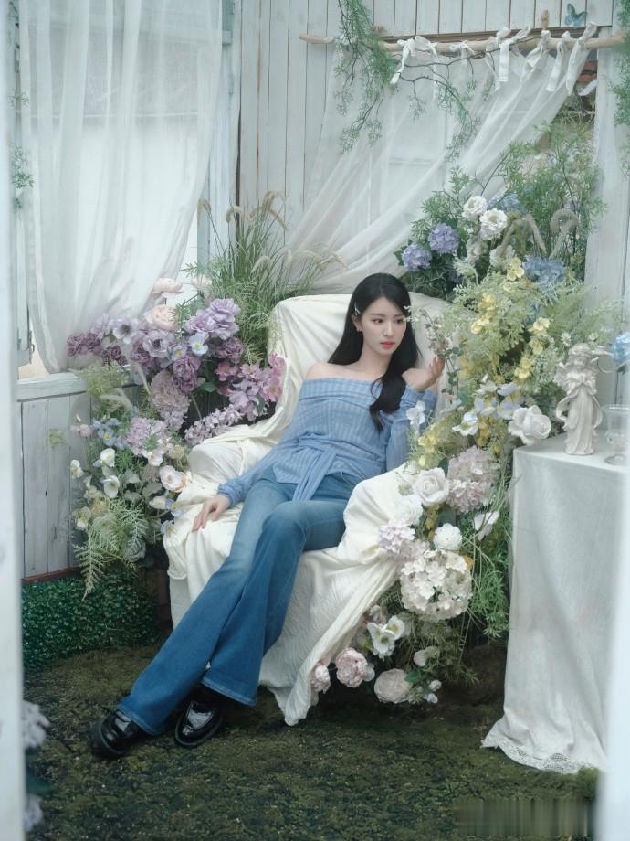 王楚然一字露肩衫搭配包臀低腰牛仔裤更显完美身材