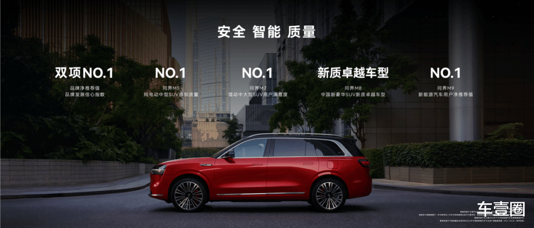 凭借在安全、智能、质量等方面的突出表现,问界在多项测评中成绩斐然。在品牌发展信心指数、品牌净推荐值等测评中斩获佳绩,问界M9登顶新能源SUV车型NPS榜首,问界M7、问界M5分别在混动中大型SUV用户满意度、纯电动中型SUV感知质量测评中夺冠,刚上市的问界M8同样荣获了“2025中国新豪华SUV新质卓越车型”认证。