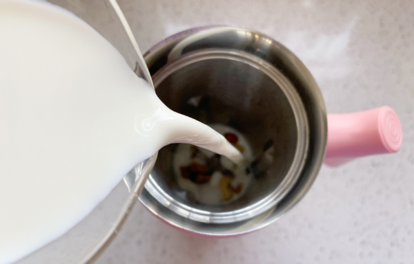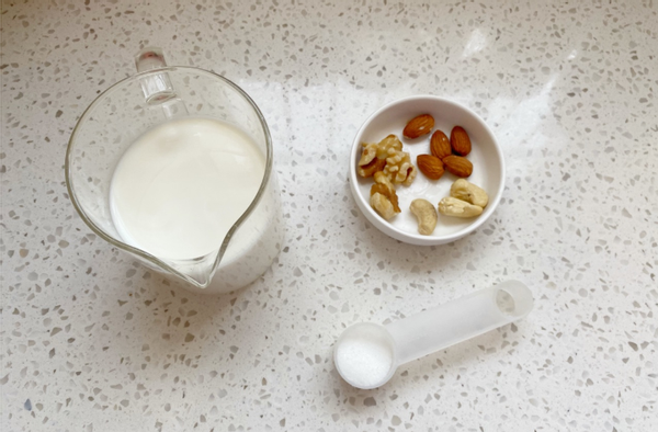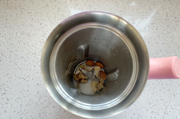 核桃仁5克,杏仁5克,细砂糖8克,腰果5克,牛奶280克。