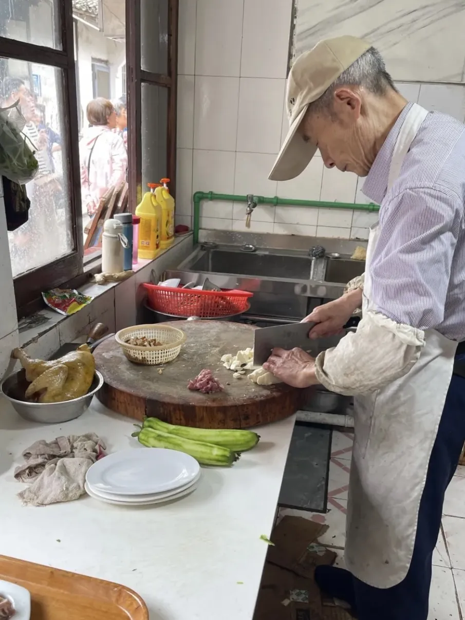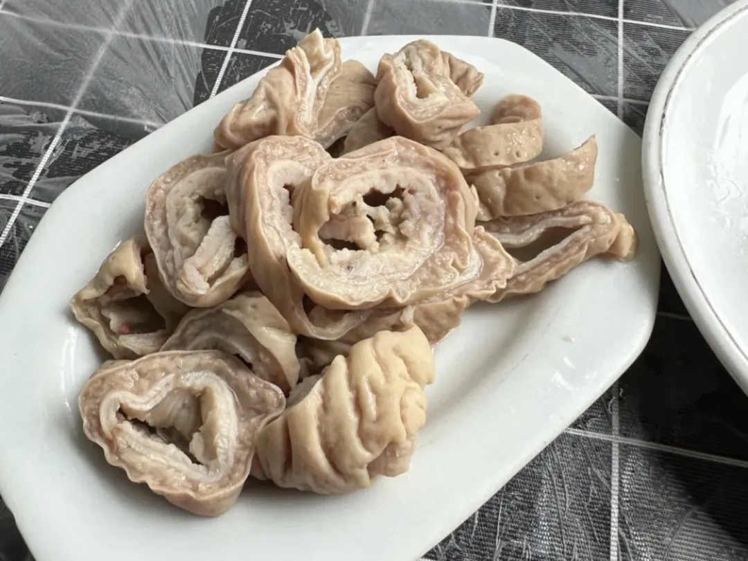 白切大肠:大肠不放重口味的调味料,单纯做成白切,一定是非常考验师傅水准的一道菜。从来不吃大肠,但还是好奇一家百年老店做出的味道,尝了一口,口感软糯,处理很干净,没有半点腥味!大概是这个旅程最惊艳的菜!