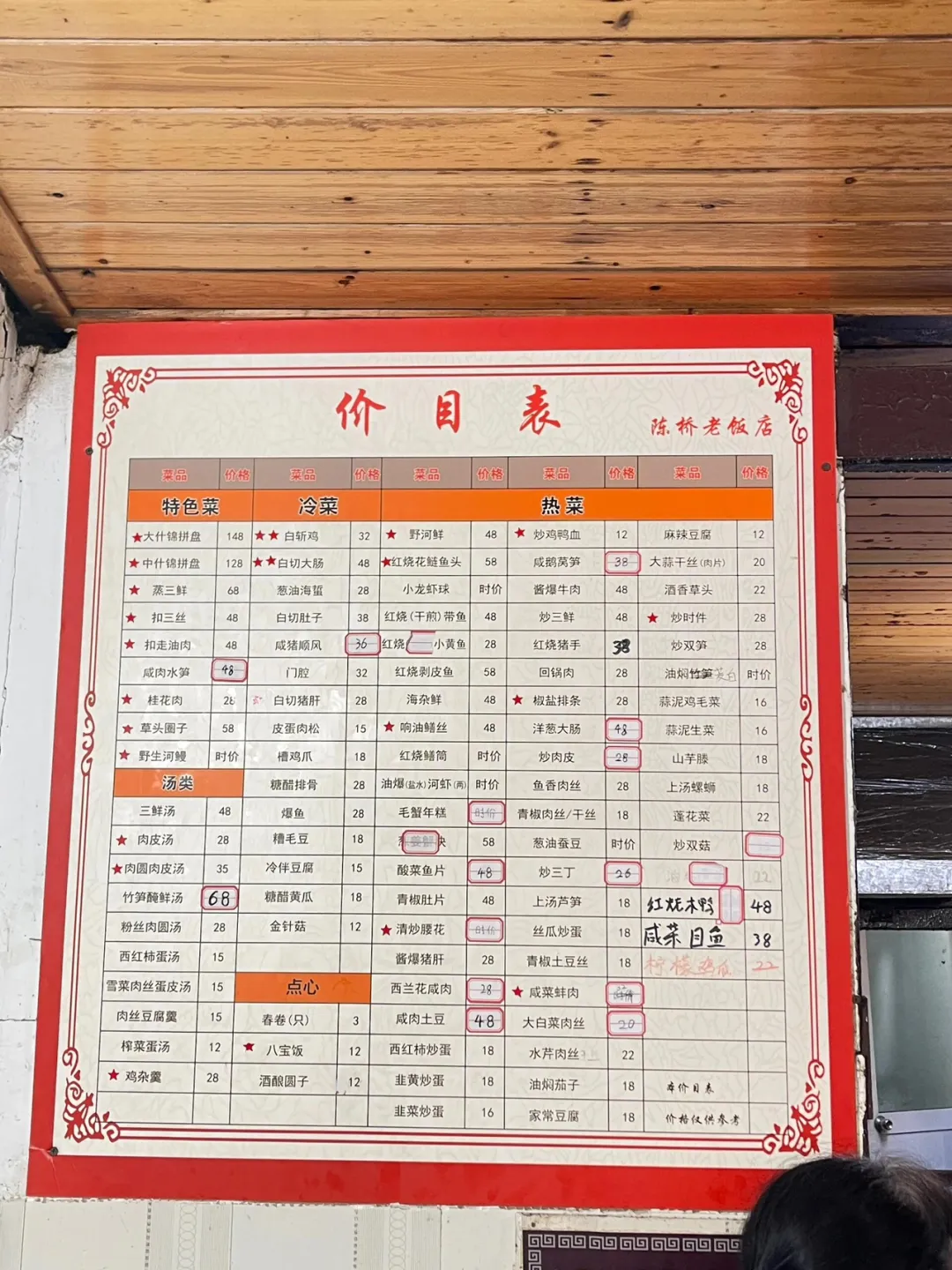过了一个小桥,看到墙上的大招牌【陈桥老饭店】,往巷子里走,才5点多,各个屋子里都坐满了吃饭的人。老板娘坐在屋子里点菜,先点菜,点完菜,付钱,老板娘会带你找位子的。坐好,就可以等上菜了!