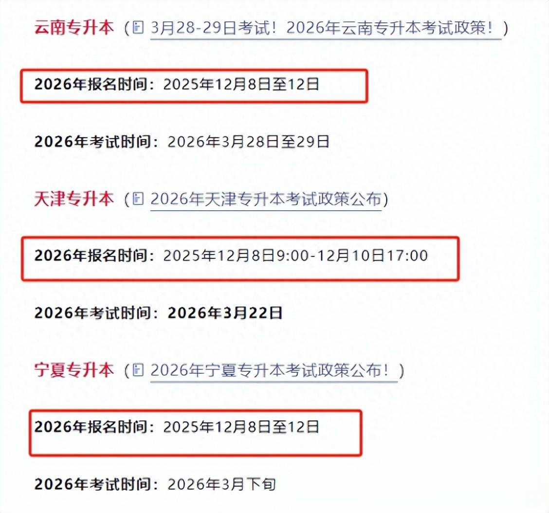 12月8日云南、天津、宁夏专升本报名正式开始。