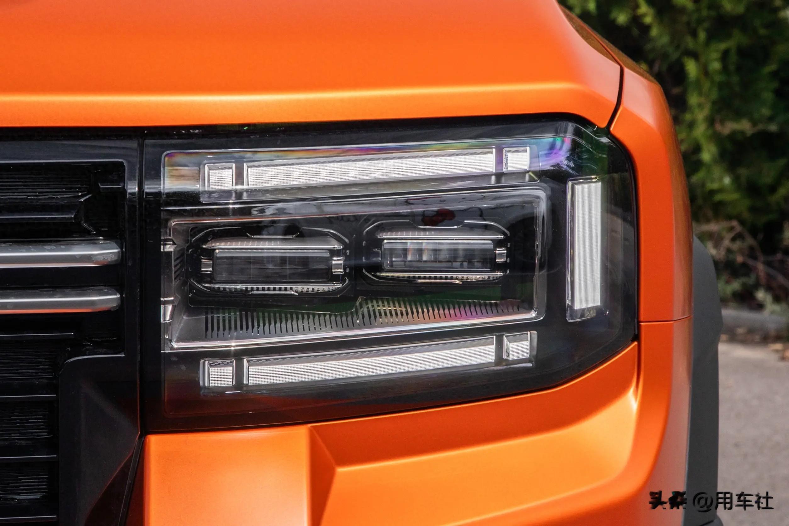 车头下方可以看到大面积银色护板,整个车头比较厚实挺拔。来到侧面,可以看到线条的使用比较用心,尾部弯折线条营造出立体效果,轮眉、门把手以及车窗周围都用了黑色饰条点缀。车尾的话,外挂式全尺寸备胎显然是这个级别车型的标配,两侧长条状的尾灯组辨识度较高,上方则是细长且横向布局的高位刹车灯。