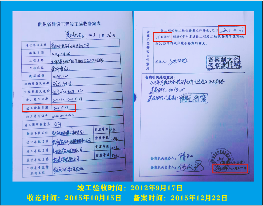 我们从时间上看,《建设工程竣工备案表》竣工验收时间为2012年9月7日,备案机关收到的时间为2015年10月15日,也就是说,从竣工验收到报备,时间为3年零38天,也就是说,从竣工验收到报备,经过了1100多天,如果从备案完成的时间看,更是高达1200多天。