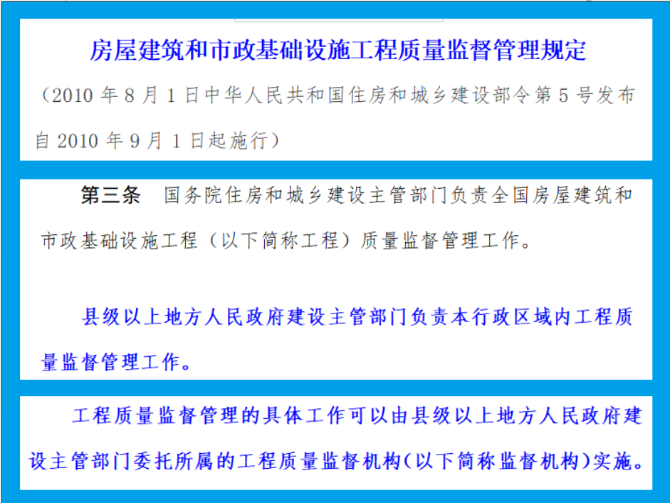 根据《建筑和市政基础设施工程质量监督管理规定》(以下简称规定)第三条规定,县级以上建设主管部门负责本行政区域内工程质量的监督管理工作,具体工作委托工程质量监督机构实施。
