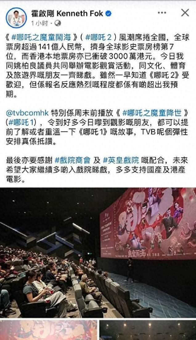 最近香港有部动画片《哪吒之魔童闹海》火得不得了,听说票房都冲上三千万了!这数字听着吓人吧?要知道今年春节档其他电影加起来都没它卖得好。我有个亲戚上礼拜专门坐高铁去香港看,回来说电影院挤得跟菜市场似的,连第一排都坐满了人。这哪吒真是够闹腾的,把香港人的钱包都闹开了花。说到这儿不得不提霍启刚。那天首映礼上,这位霍家大少爷穿得跟邻家大哥似的,白衬衫配黑裤子,站那儿跟观众握手聊天。要是不说,谁能想到这是香港艺术界的大佬?更逗的是,后来他又自己掏腰包请人看电影。我朋友就在现场,说霍启刚和立法会的姚议员站在影院门口迎客,跟超市开业似的,见人就问"食饭未啊",完全不像豪门公子。这霍少爷搞文化确实有一套。听说他专门组织了清洁工、外卖小哥这些基层群众来看电影,现场还准备了盲文场刊。有个视障朋友跟我说,他这辈子第一次"看"动画片,全靠志愿者在旁边讲剧情。这种操作真是暖心,比那些只会走红毯的明星实在多了。