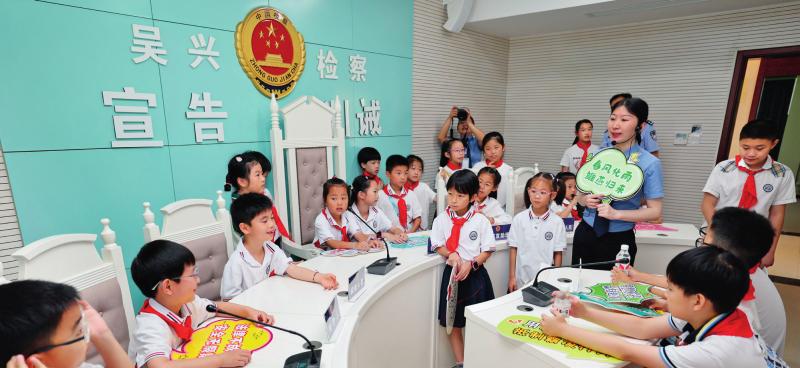 ↑浙江省湖州市吴兴区人民检察院检察官带领小学生参观未成年人检察办案区(2024 年 7 月 3 日摄) 黄宗治摄 / 本刊