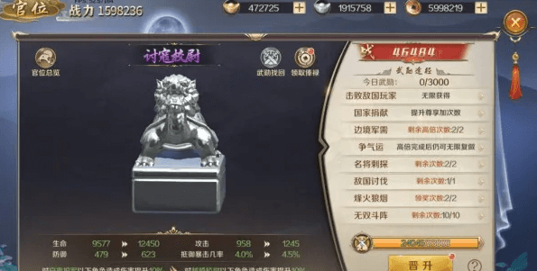在游戏中,战斗力的高低是衡量将军强大与否的一个标准,我们接下来就谈谈如何提升将军的战斗力。1、卡牌卡牌系统有很多种的不一样的方式,需要选择适合自己自身所选职业的契合属性进行激活,激活成功后不仅增加大量战斗力,还会使在实战中的表现更加强大。卡牌的获得也有多种不同的途径,直接的就是在点将阁系统中进行抽取,也可以在图商使用将魂购买(将魂可以通过分解武将卡牌获取),银锭抽取获得白绿蓝卡牌,元宝抽取获得紫橙红卡牌。总而言之,努力去收集吧!