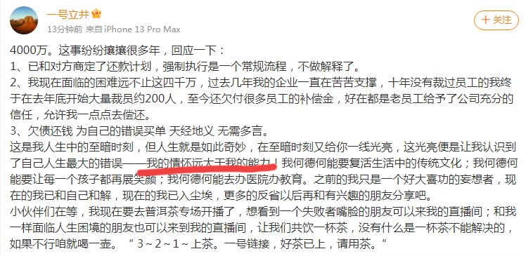 其实,早在23年,他就自嘲现在是人生的至暗时刻,也对现实妥协,认识到自己人生的最大错误是“情怀远大于能力”。