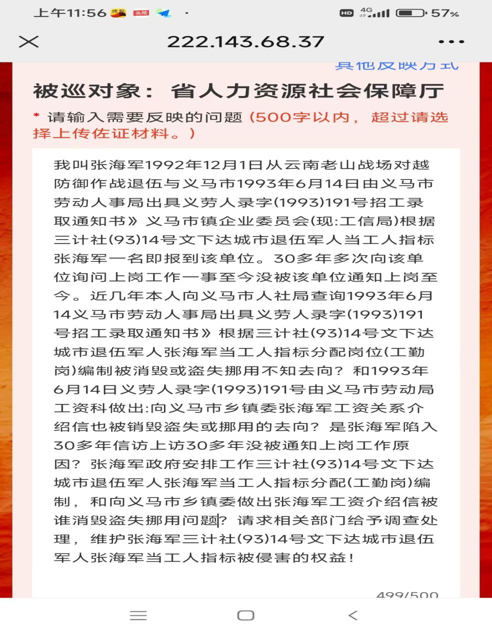 根据《兵役法》《退役军人保障法》第25条(一)项及国务院《退役军人安置条例》第75条规定;政府应依法落实退役军人安置政策。然而,张海军作为参战老兵,却陷入长达30多年的维权困境。他的遭遇并非个例,许多退役军人同样面临安置不落实、档案丢失等问题。目前,张海军仍在寻求这三个问题的答案:“三计社(93)14号文”中,招收张海军的指标究竟流向何处?为何招工通知书和工资介绍信原始档案无法查询?相关部门何时能依法落实招收城市退伍军人张海军当工人指标上岗工作?