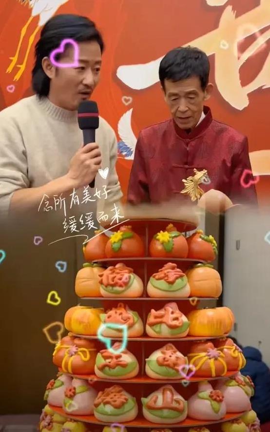 孙子无忧向爷爷说出祝福语过后,吴京便与父亲一起开始切蛋糕,蛋糕非常豪华,总共有8层,最上边是一个大寿桃。