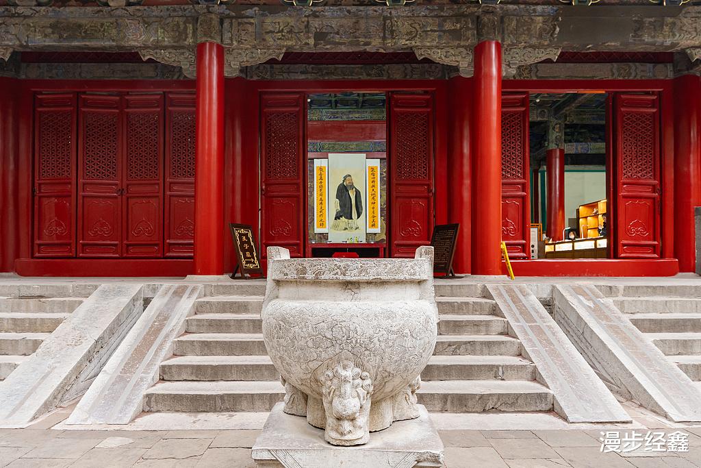 这座明代城墙上书写四个红色大字:万仞宫墙,迈步向前四个牌坊:金声玉振、棂星门、太和元气、至圣庙坊。穿过十三碑亭,后面是严格按照礼制建造的宗庙建筑群,孔府位于孔庙承圣门右手边。