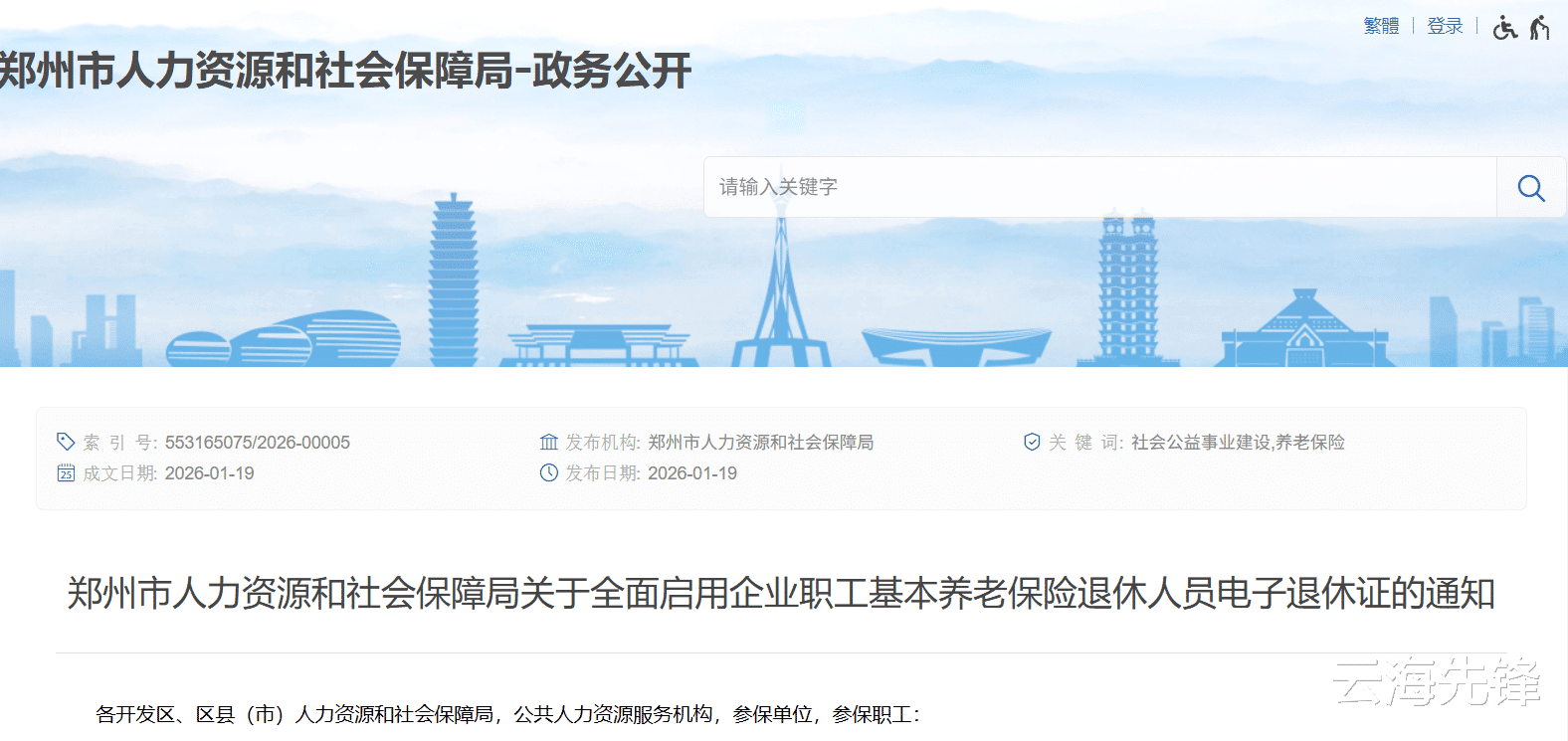 1月19日,郑州市人力资源和社会保障局发布通知,自2026年1月1日起,郑州市全面启用企业职工基本养老保险退休人员电子退休证。