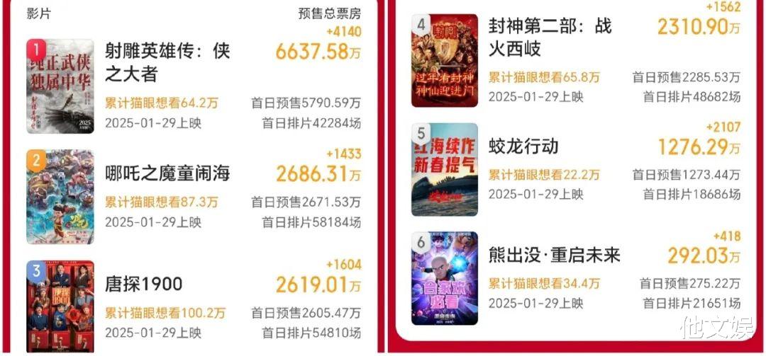 综上所述,5部大片齐上阵的2025年春节档,《射雕英雄传:侠之大者》先声夺人,拿到超高的预售成绩,在情理之中。《哪吒之魔童闹海》大概率会是春节档的票房冠军。至于其他名次,就留给《封神第二部》《蛟龙行动》《唐探1900》去争吧。