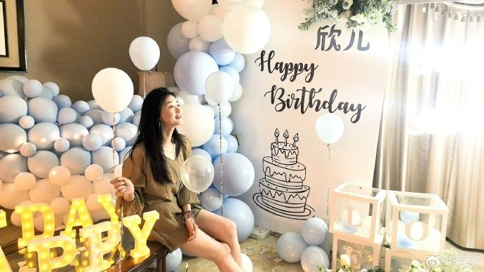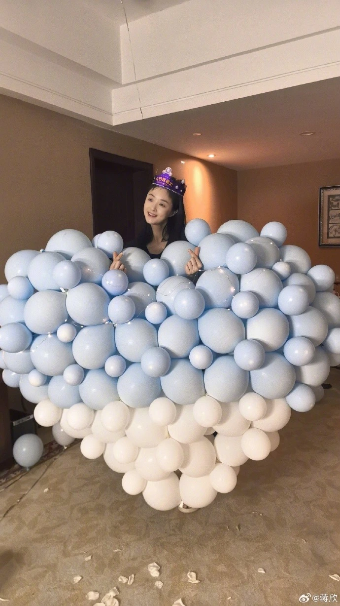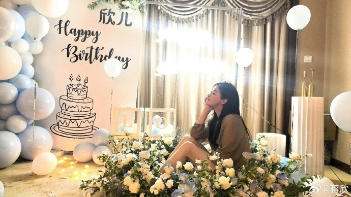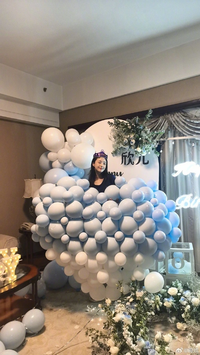 再看现场布置,简直太用心了。蓝白色的气球被扎成各种形状,堆在角落里,就像一片梦幻的气球海洋。有几个气球还被做成了小动物模样,憨态可掬。墙上挂着的背景板,印着蒋欣的照片,都是她这些年在荧幕上的经典瞬间,旁边还点缀着洁白的鲜花,有百合、玫瑰,花瓣娇嫩,香气仿佛都要溢出屏幕。地上也铺着一圈花,除了玫瑰,还有小巧的雏菊,走在上面,感觉像踏入了花的小径。