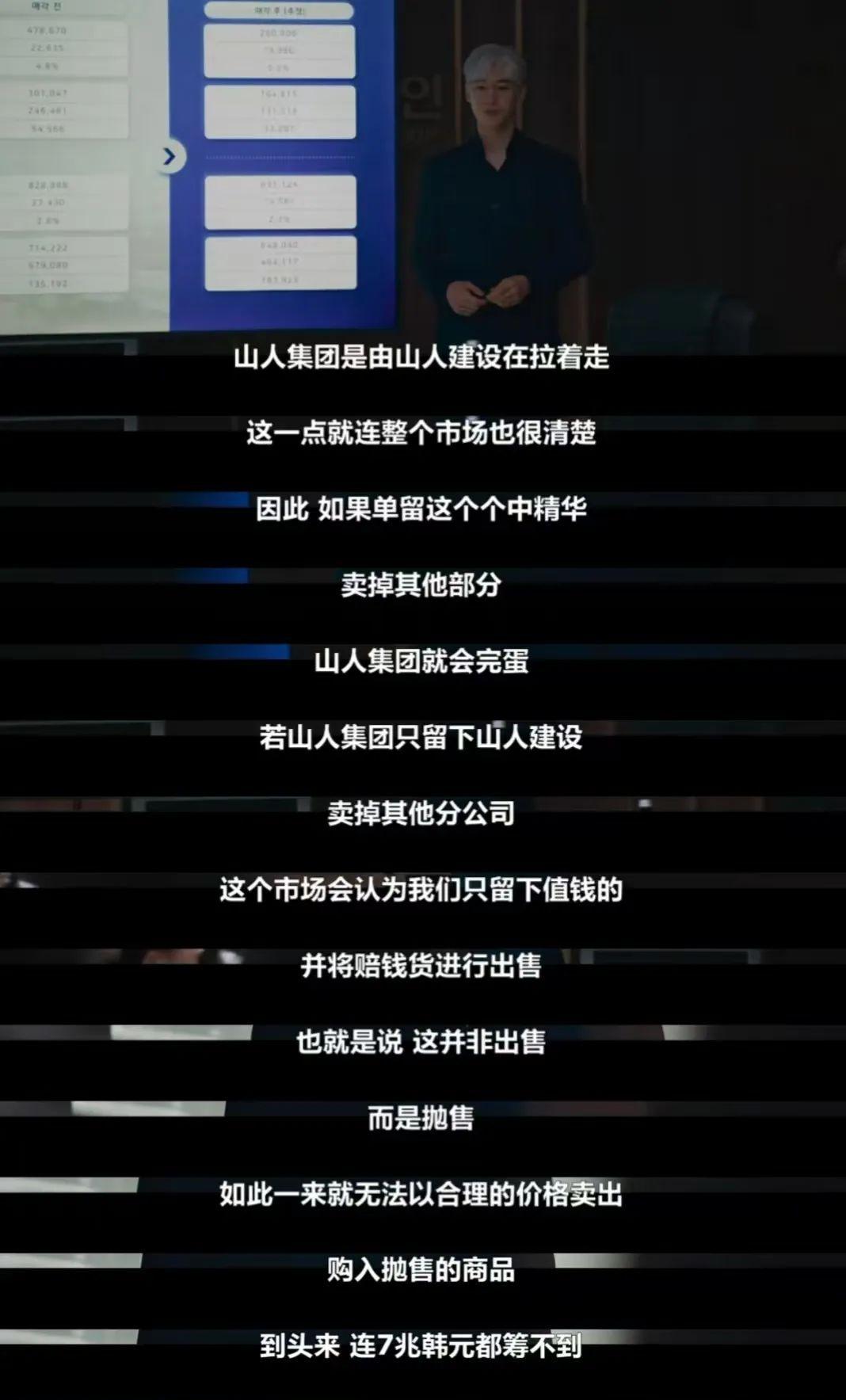 故事伊始,山人集团面临着11兆韩元的巨额资金缺口,内部斗争也愈演愈烈。以河专务为首的一派主张“断臂求生”,砍掉非核心业务;而李常务则力排众议,聘请尹洙诺主导M&A项目,试图另辟蹊径。尹洙诺的策略与河专务截然相反,他决定先出售集团的利润中心——山人建设,在危机全面爆发之前以高价套现。由此,一场没有硝烟的商业战争正式打响。