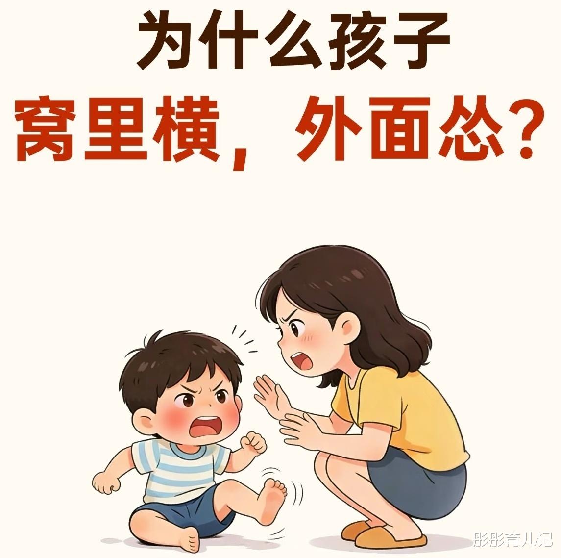 经常听到有妈妈在一起聊天时发愁:孩子在家像个小霸王,想干什么就得干什么,稍不顺心就发脾气,对着家里人又喊又叫,有时甚至还动手。可一出门,立马像变了个人,胆小得不行——别的小朋友拿了他的玩具,他都不敢吭声,只会往妈妈身后躲。这种“窝里横,外面怂”的孩子,在生活中还真不少见。当家长的看到孩子这样,心里肯定又着急又纳闷:这孩子怎么两副面孔呢?其实,孩子出现这种情况,多半和家庭的教育方式有关,咱们做父母的,不妨先从自己身上找找原因。