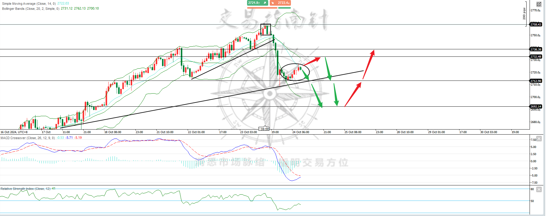目前来看黄金触底反弹呈上涨趋势,不建议去盲目追多,等待回撤至2713支撑位出现反弹信号做多。今日策略: