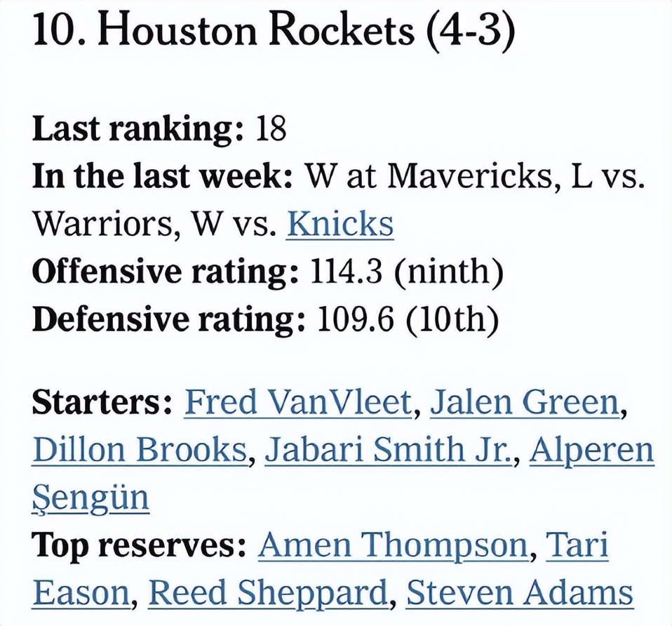 4胜3负的休斯顿火箭在美国媒体TA的最新的NBA实力榜排名第十,上一期他们只排名第十八位。这支球队的防守效率排名联盟第十,失分排名联盟第五,篮板排名联盟第四,前场篮板排名联盟第一。火箭的进攻效率排名联盟第九,但是场均命中三分球只排名联盟第十四。