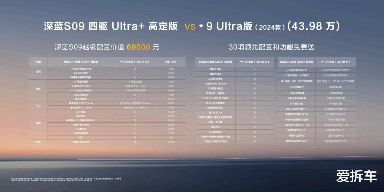 深蓝S09作为一台“家庭大六座智慧旗舰SUV”,从产品力来看,它完全就是一台为年轻奋进者打造的家庭大六座智慧旗舰SUV,30万价格获得百万级享受,不得不说非常具有吸引力。从“体验领先、价值越级”的驾乘体验,到为用户带来更具魅力的智慧出行,无论产品价值和品牌实力方面,深蓝S09不输给市面上任何一款同类产品,相较而言,深蓝S09空间全面越界,智能超乎所想,担得起大六座9系新标杆。而且,拥有深蓝超级增程2.0,华为全家桶、全新平台和底盘等一系列行业领先的技术优势的深蓝S09,更能重新构建旗舰大六座SUV的标准。让更高级的享受唾手可得,把体验升上去,把价格打下来,深蓝S09智能豪华真平权,正在30万级大六座SUV市场,打响“越级之战”!如果你正在为家人选择一辆大六座SUV,那就选深蓝S09,大六座9系新标杆,无需多问,无需多想,闭眼入!