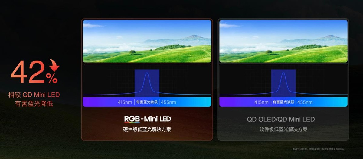 海信E7S Pro的核心卖点,就是彻底解决了这个问题。它搭载了海信全新研发的RGB-Mini LED技术体系,核心在于那颗全自研车规级高光效RGB发光芯片。简单来说,以前电视是用蓝光“染色”成彩色,而E7S Pro是用红、绿、蓝三色光直接“调和”出彩色。这带来的直观改变是,屏幕色彩变得极其纯粹。