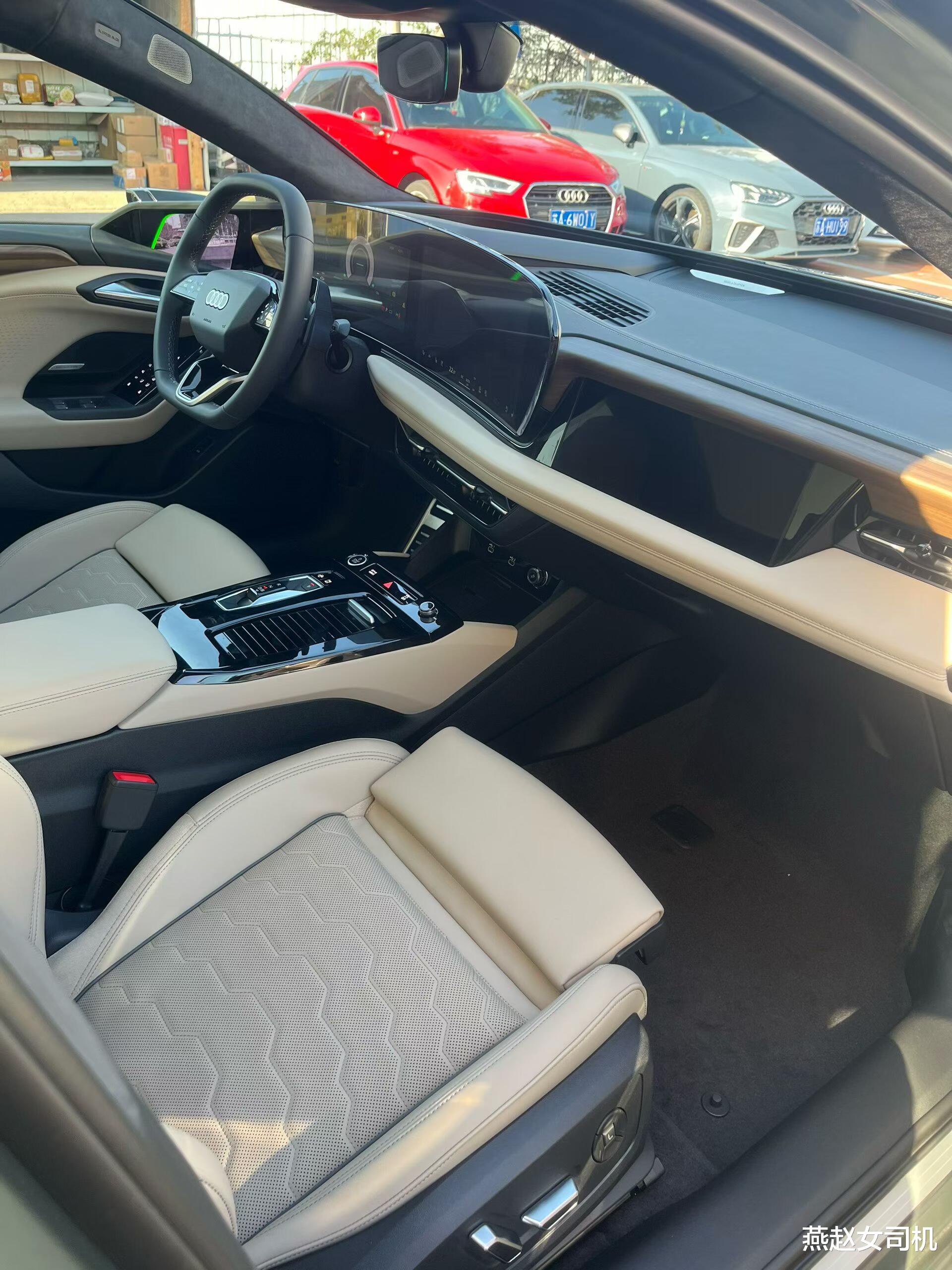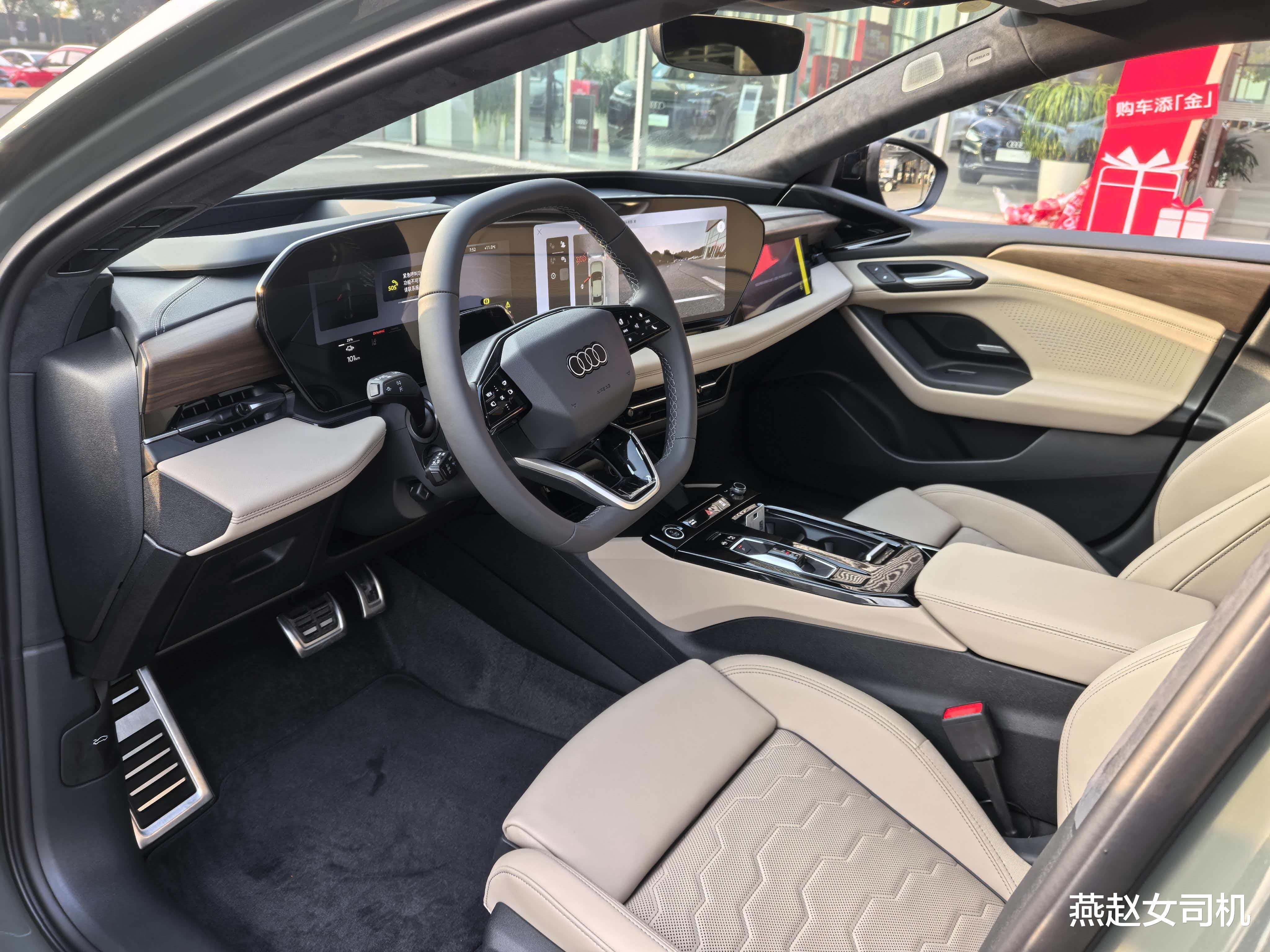 内饰也是最新家族化设计,环抱式的座舱内配备由11.9英寸奥迪虚拟驾驶舱(液晶仪表屏)+14.5英寸MMI触摸显示屏组成的曲面双联屏,再配合10.9英寸副驾娱乐屏、电子后视镜显示屏以及88英寸AR-HUD,营造出满满的科技氛围,并搭载全新UI/UX交互系统。而大量皮质/麂皮包覆配合木纹饰板点缀以及氛围灯,又带来豪华气息,还配备双平底多功能方向盘、滑块式换挡机构等。