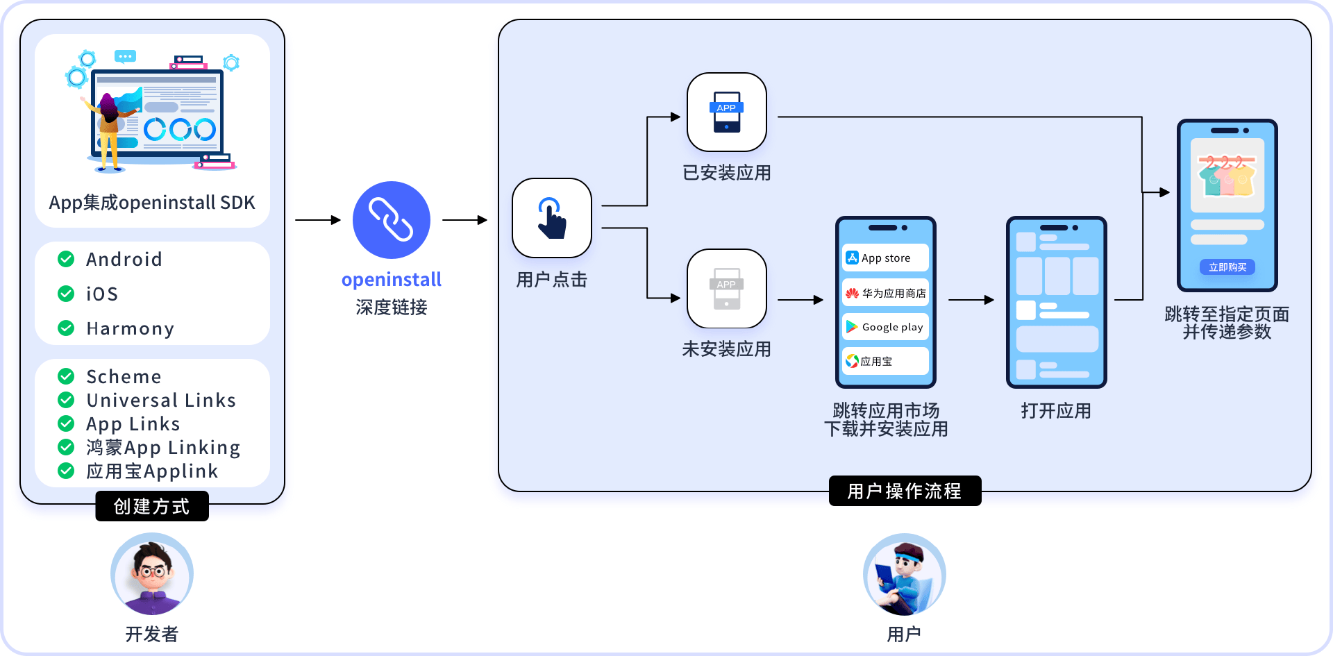 1、所有DeepLink方案一站式集成:openinstall集成了上述提到的各种深度链接方案,国内外均适配Universal Links与URL Scheme,国内同时提供应用宝Applink以及鸿蒙App Linking,海外兼容谷歌App Links等最先进和通用的DeepLink方案,真正做到全球深度链接一站式通用。