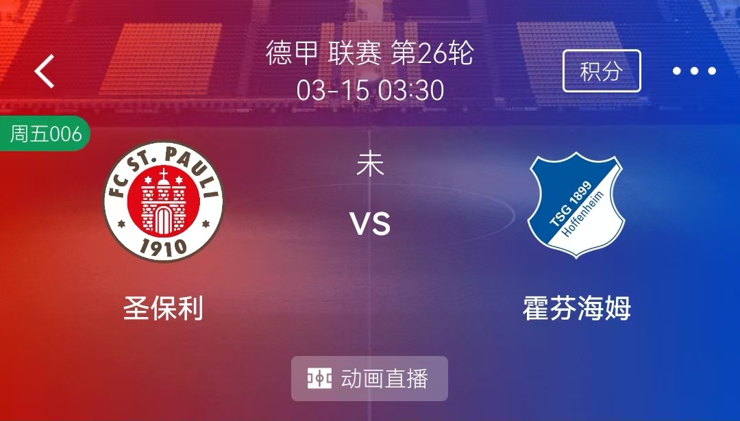 霍芬海姆是德甲联赛的中游球队,但是他们本赛季有欧战任务在身的情况联赛表现不太理想,目前球队以6胜8平11负的战绩仅排在德甲积分榜第14位。从近况来看,霍芬海姆上轮联赛主场1-1战平海登海姆,近4轮联赛取得2胜2平,保持不败,球队整体状态有所提升。进攻端方面,霍芬海姆近10场正赛打进18球,场均进球1.8球,仅1场未能取得进球,球队近期进攻效率值得肯定。球员方面,霍芬海姆主力中场斯塔赫(21场20首发)此前联赛吃到黄牌,上轮联赛因累计黄牌数被罚停赛,本场比赛将解禁,有望复出。而且值得一提的是,霍芬海姆身价≥圣保利身价的3倍,霍芬海姆阵容实力对圣保利有一定优势。