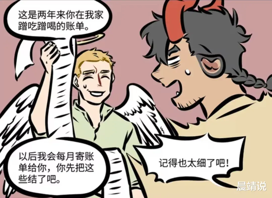 大家好,这里是晨靖说。《1031万圣街》讲述了一群来自不同地域的外国神仙妖怪在中国合租贡献GDP的故事。跟随晨靖一起往下看:故事第325话,今天照旧在1031室蹭吃蹭喝的尼克,突然被林老师喊住有话说。林老师为难纠结的表示你来我家频率那么高,本来我觉得有些事不用我说你也明白,但是你一直没有表示......林老师的话,让尼克想入非非的脸红了,以为林老师是要说什么吗。内心小鹿乱撞的尼克,突然看到林老师掏出了两年来蹭吃蹭喝的明细账单,让尼克找到弟弟泥泥吐槽林老师小气!在泥泥的解释下,尼克轻易相信了泥泥的话。正感动的尼克自然也没发现,这些证据只是泥泥和林老师的合谋。