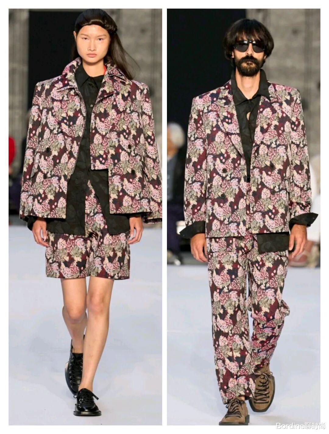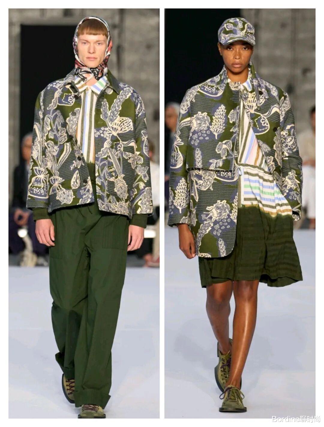 宽松廓形的套装穿搭在直线线条的利落中,结合了一些工装元素更多酷帅利落,还在色彩的对比中,撞色冲击增加了花纹的活力时尚。