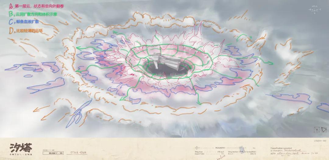 根据设定,《汐塔》在气候上接近寒武纪,整个世界被云海覆盖。云海对寒武纪生物来说是完美的生存环境,但对人类来说却有毒。因此,人类只能被迫生活在较高的陆地上或飞行器上。