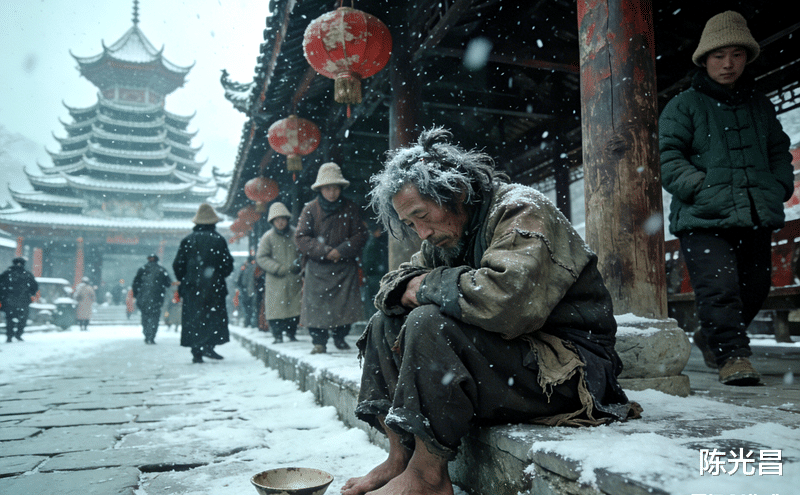“又是那个疯讨米佬,大年初一就蹲在这儿碍眼。”路过的成衣铺老板裹紧了狐裘大衣,语气里满是鄙夷,“连条像样的裤子都没有,也配在鼓楼这儿占地方?”