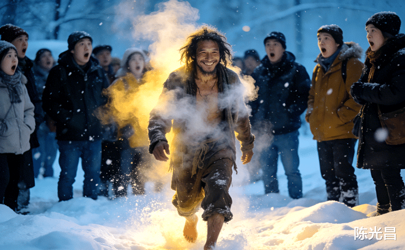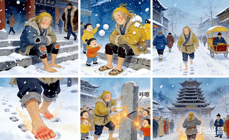 可疯乞丐却对众人的呼喊置若罔闻,依旧赤着双脚在雪地里漫步。他的脚步不快,却异常沉稳,每一步踩下去,都能在厚厚的积雪里踩出一个深深的深坑,脚印清晰可见。更让人震惊的是,他赤着的双脚不仅没有被冻得发紫发抖,反而泛着一层淡淡的红晕,周身甚至隐隐有热气升腾,仿佛他的双脚有烈火在燃烧,将漫天的严寒都隔绝在外。