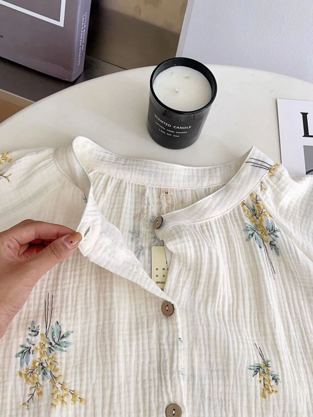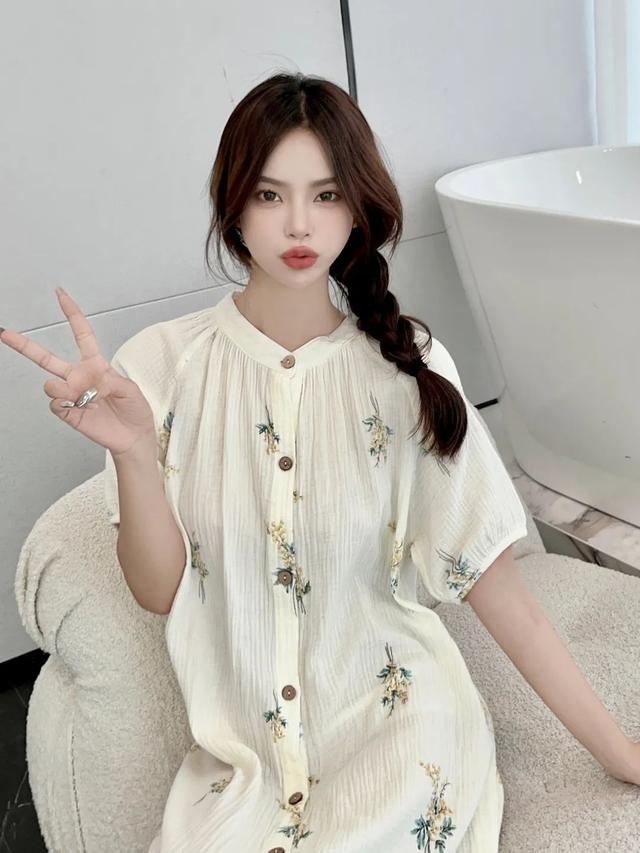 圆领纽扣设计搭配淡雅铃兰花,穿上超显气质,出门穿着也可以,衣服宽松但不臃肿,真的是太爱了~
