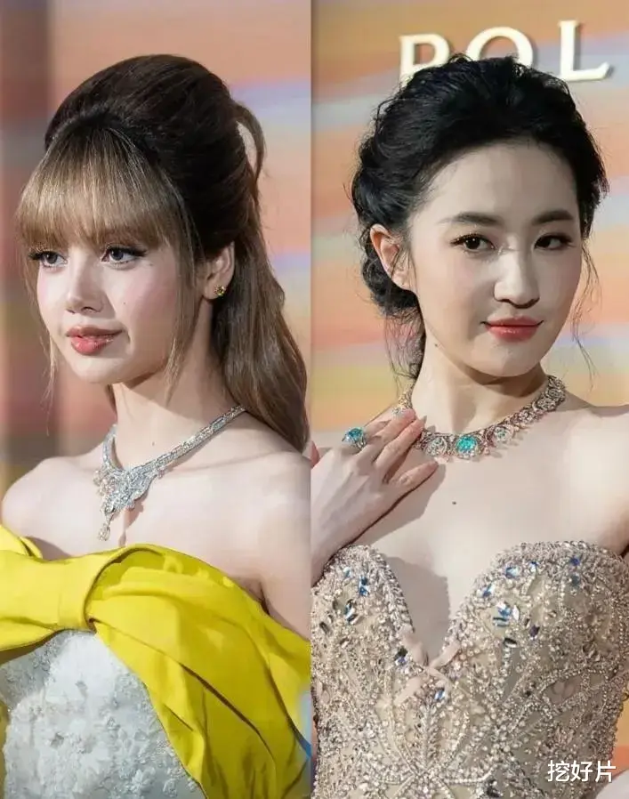 既然是珠宝的大展,当然要突出首饰了,和刘亦菲的华贵宝石绿相比,Lisa佩戴的珠宝都较为青春一些,符合她这个年龄段的女性审美。