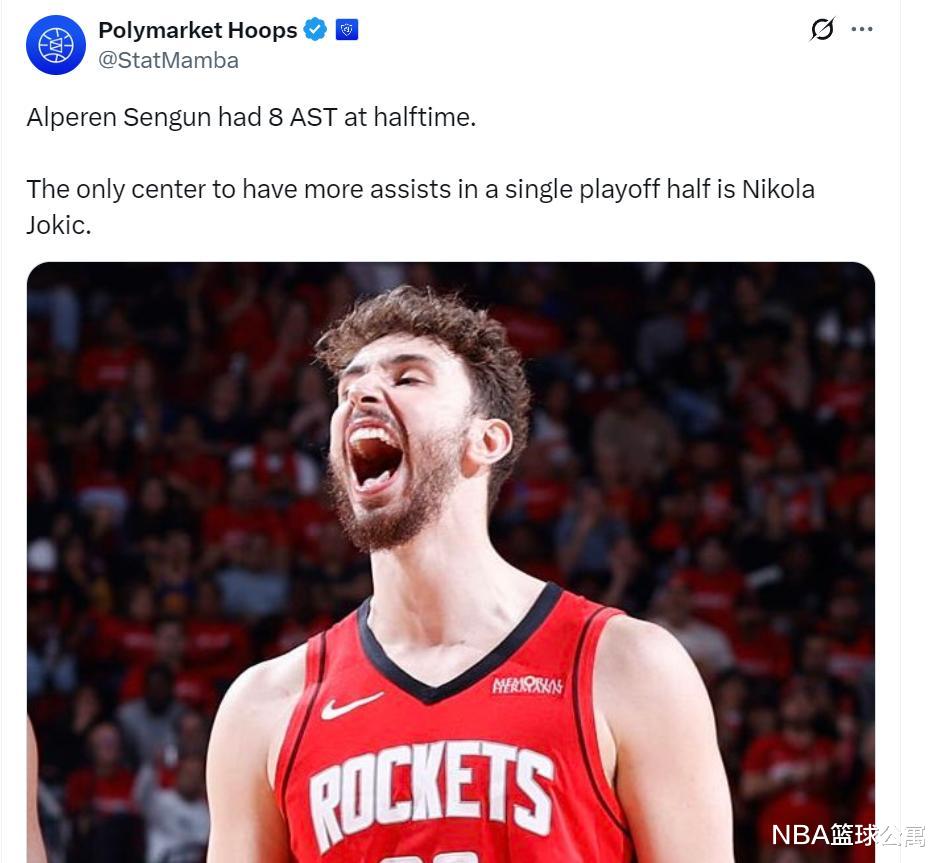 此役,申京还创下了神迹。上半场,申京独得12分6篮板8助攻2抢断。数据统计显示,申京成为NBA历史上第2个在季后赛半场送出至少8次助攻的中锋,第一位是约基奇(13次)。