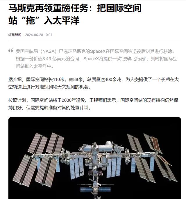 红星新闻 《马斯克再领重磅任务:把国际空间站“拖”入太平洋》 2024-06-28