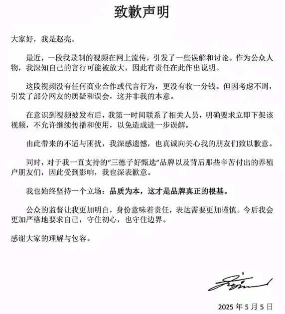 在事情发生后赵亮也会第一时间的删除视频禁止使用,为此像大家表示道歉。
