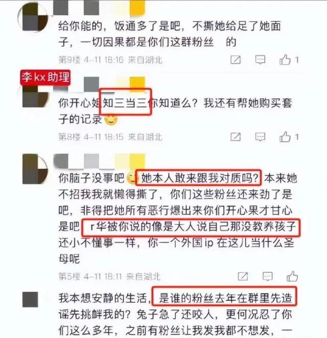 除了文化层面上的不当行为,李凯馨的私人生活也饱受争议,此前被前助理指控“知三当三”,指证人还表示,手中握有从17年到19年的相关聊天记录作为铁证,甚至还说出“爱情哪有先来后到”这样的言论。